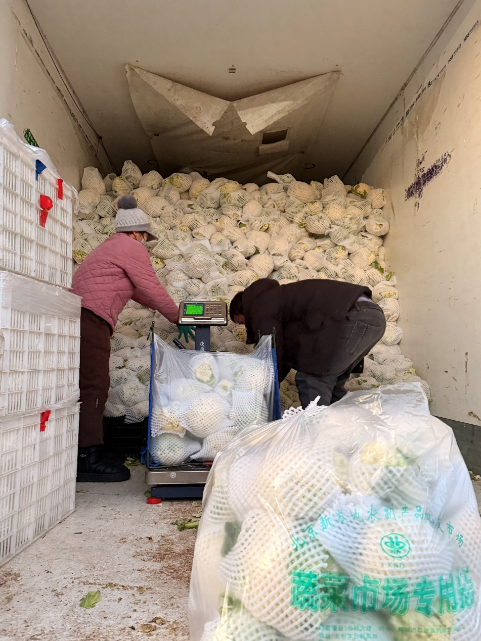 在新发地商场的“菜花区”,来自北京本地的二级经销商正在打包菜花,商户孙燕燕谦善地说,元旦当天的销量不比节前,但几挂车的销量,却透着生意的炽热。